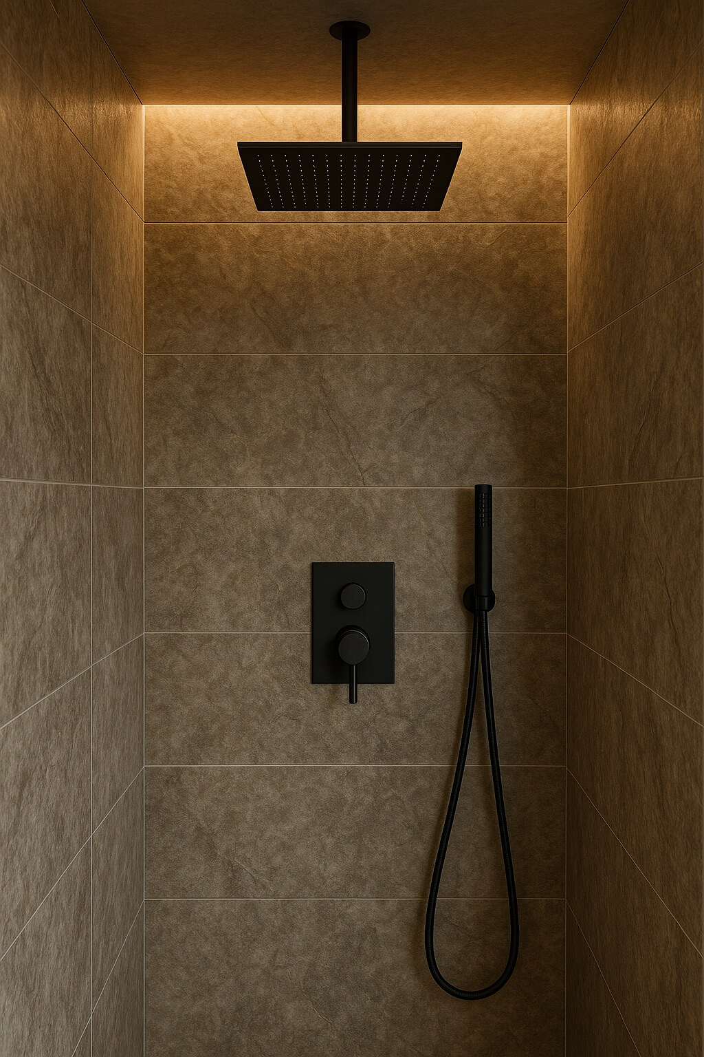 Die großformatigen Feinsteinzeugfliesen in warmen Naturtönen verleihen dem Raum eine elegante, ruhige Atmosphäre. Eine indirekte LED-Beleuchtung an Decke und Nischen betont die Architektur des Badezimmers und schafft ein harmonisches Lichtspiel, das Entspannung pur verspricht. Besonders hervorzuheben ist die offen gestaltete Walk-in-Dusche mit Regenduschkopf und mattschwarzen Armaturen – ein klares Statement für modernes, minimalistisches Design. Auch das schwebende Waschtischmöbel mit passender Beleuchtung fügt sich nahtlos in das hochwertige Gesamtkonzept ein.