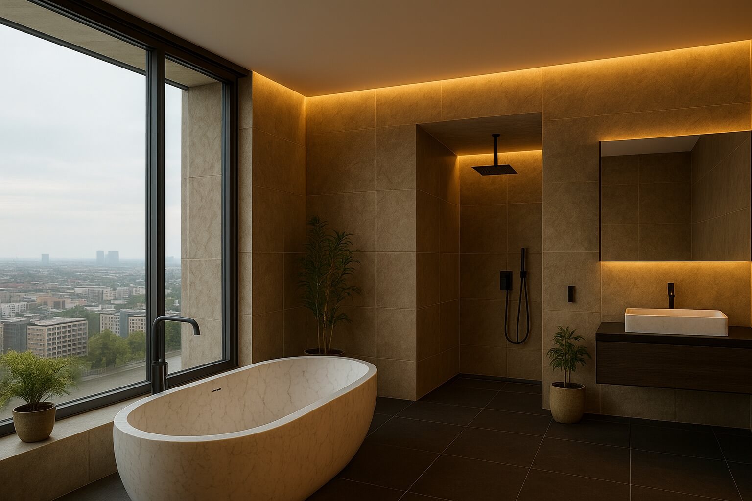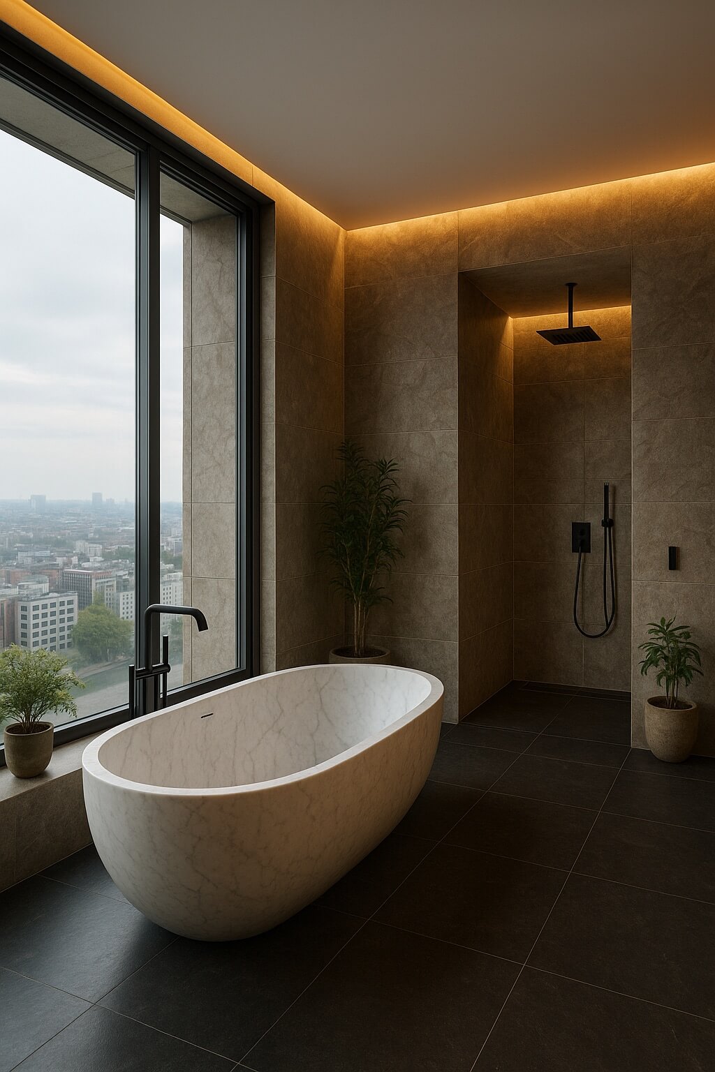 Dieses moderne Badezimmerprojekt verbindet exklusives Design mit höchstem Luxus. Im Mittelpunkt steht eine freistehende Badewanne aus edlem Marmor, perfekt positioniert vor einer raumhohen Fensterfront mit atemberaubendem Blick über die Stadt.