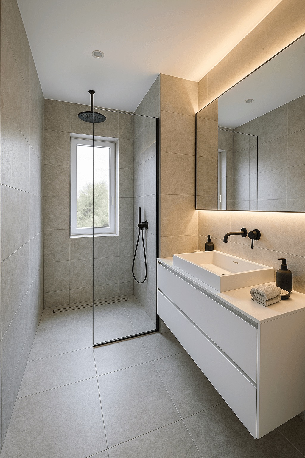 Die großformatigen Feinsteinzeugfliesen in warmen Beigetönen schaffen eine harmonische und ruhige Atmosphäre. Der bodengleiche Duschbereich mit rahmenloser Glaswand und Regendusche sorgt für Großzügigkeit und Barrierefreiheit. Die schwarzen Armaturen setzen markante Akzente und unterstreichen den modernen, puristischen Charakter des Badezimmers.